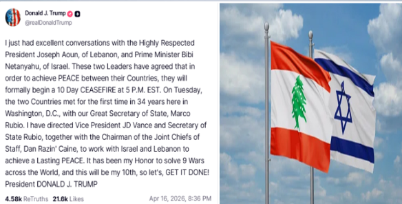 لبنان اور اسرائیل کے درمیان 10 روزہ جنگ بندی پر اتفاق ہوگیا، ٹرمپ کا اعلان
